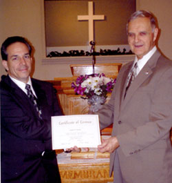 Robert Meade (left) was licensed to the ministry by College Park Baptist Church, Ladson, on Jan. 1. He serves as a deacon and Sunday school director at College Park, and is currently enrolled as a ministerial student at Charleston Southern University. Presenting the certificate of license to Meade is interim pastor Bill Archer.
