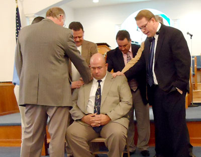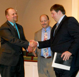 Corinth and Park Hills Baptist churches, both in Broad River Association, held a combined worship service at Corinth on Jan. 8 to ordain Michael Travis Ohler to the ministry. He currently serves as youth director at Park Hills, but Corinth is his home church. The service was led by Dwight Easler, pastor of Corinth, and Larry Sanders, pastor of Park Hills, shown presenting the ordination certificate and a Bible to Ohler.