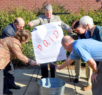 The members of Crosspoint Baptist Church, Sumter, held a mortgage burning on Jan. 8 after paying off the note on their building. Pictured from left are Belva Hickson, Tommy Hickson, pastor John Sorrells, Joe Tanner, Verne Newman, Sally Jennings and Tim Wilson.