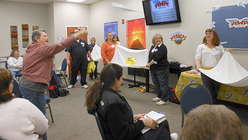 Tossing paper airplanes into white towel “clouds” gave Katie Lewis and her fellow associational Vacation Bible School directors the opportunity to exchange ideas for promotion, evangelism, and follow-up in Vacation Bible School. This was one of many airplane-related activities that took place at the State VBS Clinic centered on the theme of “Amazing Wonders Aviation.”