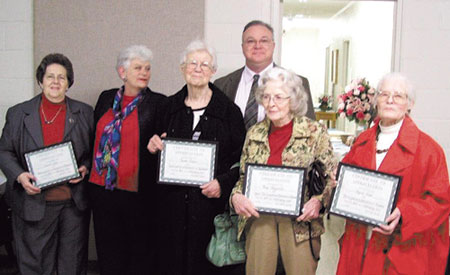 A “Focus on WMU” reunion was held Feb. 19 at First Baptist Church, Leesville. Certificates of appreciation were presented to the group leaders for their many years of service. Pictured with pastor Charles Leonhardt are Drucilla Long (Mission Movers), Susan Hallman (current WMU director), Tense Patton (current missions), Faye Reynolds (former GA and Acteen leader) and Myrtle Bush (longest-serving member). A luncheon was held in their honor following the presentation.