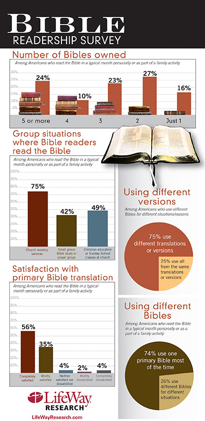 “When people say ‘my Bible,’ that has a meaning that includes translation,” said Ed Stetzer, president of LifeWay Research. “Bible readers usually have multiple Bibles, but three out of four have one physical Bible that they use most of the time.”