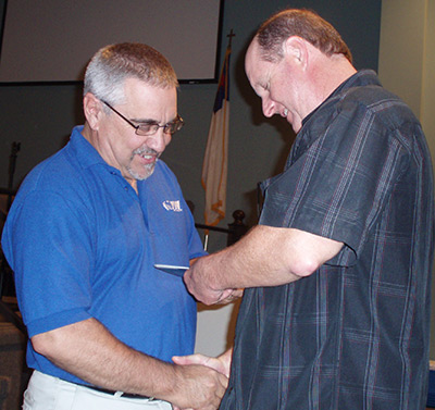 Tim Conrad, left, of Colorado’s UW Sports Ministry, presents Ralph Jett, pastor of Brown’s Chapel Church in Pacolet Mills, with a $600 sports camp package for use with up to 50 kids. Jett won the package in a drawing held at the SCBC Evangelism Conference. “I prayed and told the Lord it would be really cool if our church won this, because we had a community sports camp last summer for the first time and saw several children get saved. This is such a blessing,” Jett said.“There is power in God’s holy word. Instead of reading the Roman Road to the person you’re witnessing to, ask them to read the verses out loud. Ask them what they think it means,” Perkins suggested as another way to “win the one.”