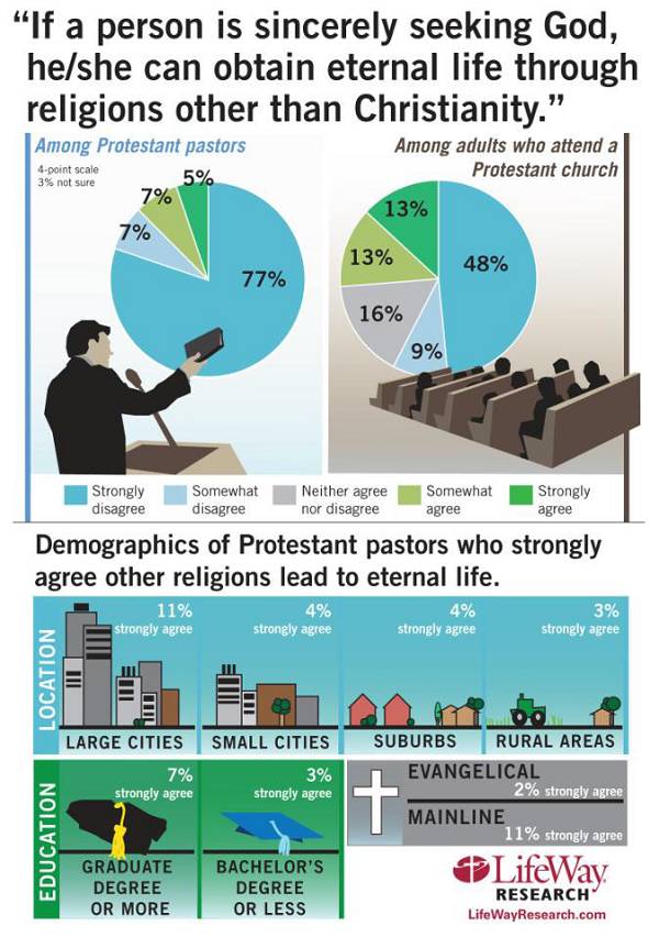 Nearly eight in 10 Protestant pastors strongly disagree that eternal life can be obtained through religions other than Christianity, according to a survey by LifeWay Research.