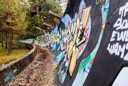Today, the bobsled and ski jump areas have been all but destroyed and are covered with graffiti and pockmarked with holes created by mortar shells.