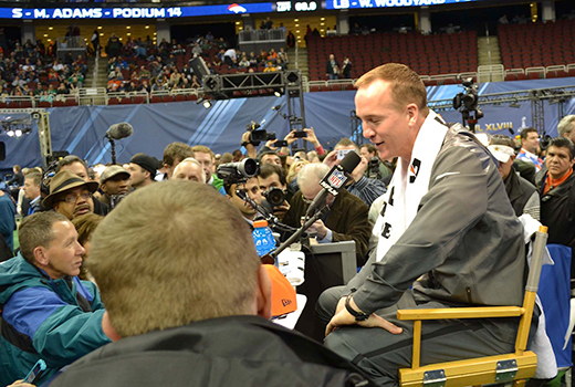 Peyton Manning, Denver’s star quarterback, answers questions during Super Bowl media day Jan. 28 at the Prudential Center in Newark, N.J. Jacob Tamme, Denver’s backup tight end who shared about his relationship with Christ, described Manning as a “man of faith.” (Photo by Shawn Hendricks/BP)