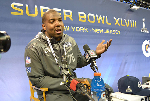 “Salvation is free for all of you. I’m a living testament that it’s real,” Russell Okung, the Seahawks left tackle said Jan. 28 during Super Bowl media day at the Prudential Center in Newark, N.J. (Photo by Shawn Hendricks/BP)