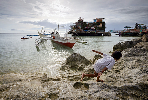 A child runs along the rocky shore at Gibitngil Island, seemingly oblivious to the destruction caused to her community by Typhoon Haiyan in November 2013. Behind her are the ruined structures of a small beach resort that provided a valuable tourism income for the tiny community.