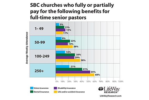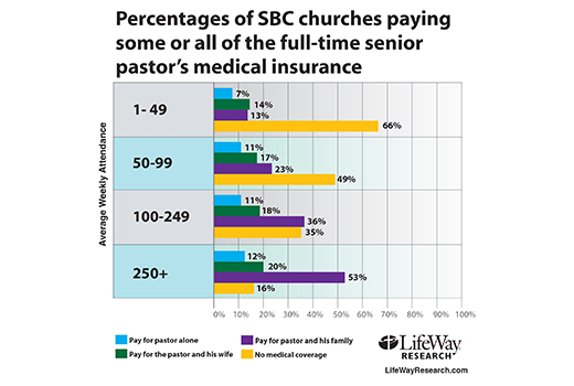 Eleven percent of Southern Baptist churches provide at least partial medical insurance funding for the full-time pastor alone, while 17 percent fund coverage for the pastor and his wife, and 32 percent supply coverage for the pastor and his family — all slightly down from 2012.