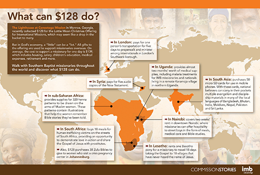 EDITOR’S NOTES: This year’s Week of Prayer for International Missions in the Southern Baptist Convention is Nov. 30-Dec. 7 with the theme of “One Sacred Effort — Find your place in God’s story” from Matthew 28:19-20 (HCSB). The Lottie Moon Christmas Offering for International Missions in tandem with Cooperative Program gifts from Southern Baptist churches support approximately 4,800 international missionaries in seeking to fulfill the Great Commission. Gifts to the Lottie Moon offering are received through local Southern Baptist churches or online at imb.org/offering, where there are resources to promote the offering. This year’s goal is $175 million.