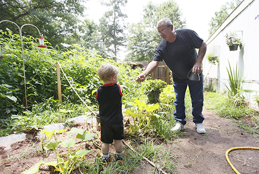 A large garden that Conestoga believer James planted and tends behind his trailer provides fresh produce for his family and others in the trailer park. A freshly picked strawberry will prove impossible for grandson Isaiah to resist. (Photo by Mark Sandlin)