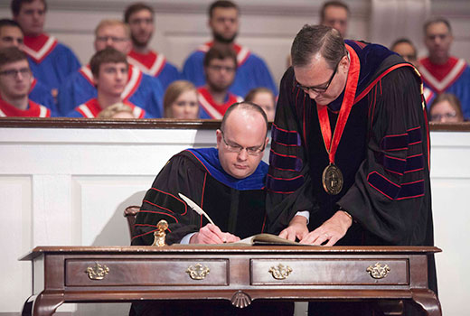 Before Mohler’s address, three professors elected to the faculty during the fall trustee meeting signed the Abstract of Principles during convocation. The Abstract is the doctrinal statement of Southern Seminary. The professors signed the original document drafted and signed by founding faculty, including James Petigru Boyce, John A. Broadus, Basil Manly Jr., along with every subsequent faculty member of the school.