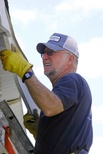 A volunteer with South Carolina Campers on Mission repairs the eaves of an aging church building in Anderson.