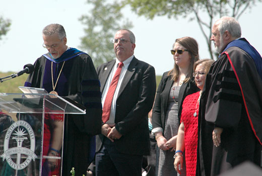 NGU interim president Randall Pannell (left) recognizes the Brent Elrod family at May commencement. Pictured with Pannell (from left) are Brent’s father, Randy; sister, Jennifer; mother, Kathy; and Steve Crouse, vice president for campus ministries at NGU. Brent died in a hiking accident at Wildcat Ranch Falls in Marietta, S.C. on Oct. 10, 2013, and would have been a member of the 2015 graduating class.