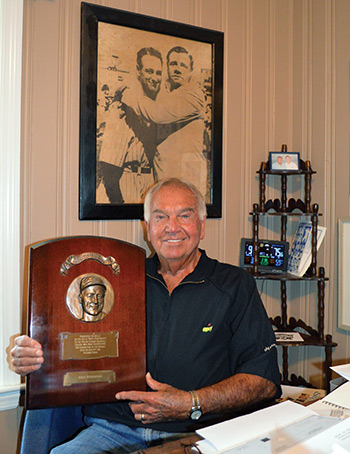 Richardson with a plaque honoring him for winning the 1962 Lou Gehrig Award. Framed above him are Yankee greats Gehrig and Babe Ruth.