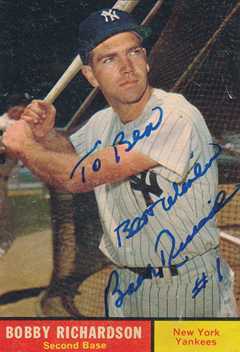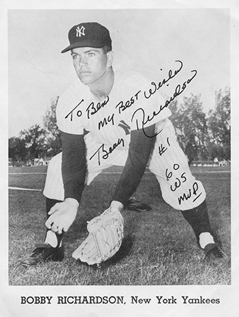 On the day Bobby graduated from high school, he signed a professional baseball contract with the Yankees, even though he was offered contracts from 12 major league teams and scholarships from two large universities. As a boy, he dreamed of playing for the Yankees after he saw “The Pride of the Yankees,” a movie that told the inspiring story of Lou Gehrig. Years later, in 1962, Richardson won the Lou Gehrig Award, which honors the player who best exemplifies Gehrig’s character both on and off the field.