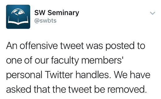 Southwestern tweeted April 25, “An offensive tweet was posted to one of our faculty members’ personal Twitter handles. We have asked that the tweet be removed.”