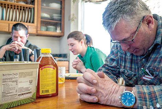 Mark Largent (right) blesses a meal shared with the family of his son David (left). Both are bivocational ministers in Wyoming. (Photo by Matt Miller)