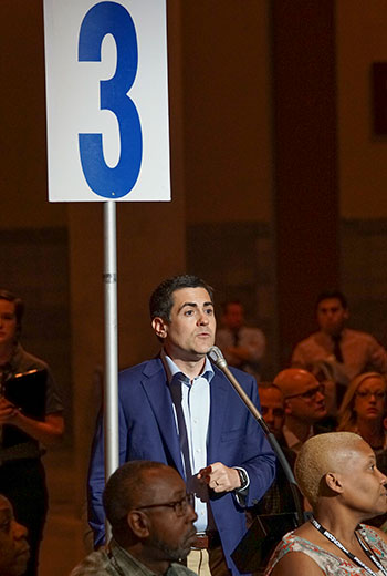 Southern Baptists overwhelmingly pass a resolution June 14 condemning the racism of the alt-right movement. Members of the Resolutions Committee that crafted the resolution, led by Barrett Duke (center), chairman, and executive director of the Montana Southern Baptist Convention, vote for its passage. (Photo by Bill Bangham)