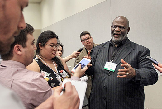 William Dwight McKissic Sr., pastor of Cornerstone Baptist Church in Arlington, Texas, speaks with reporters after a resolution similar to one he submitted June 13 on racism was unanimously approved June 14. Messengers adopted a resolution “on the anti-Gospel of alt-right white supremacy.” (Photo by Van Payne)